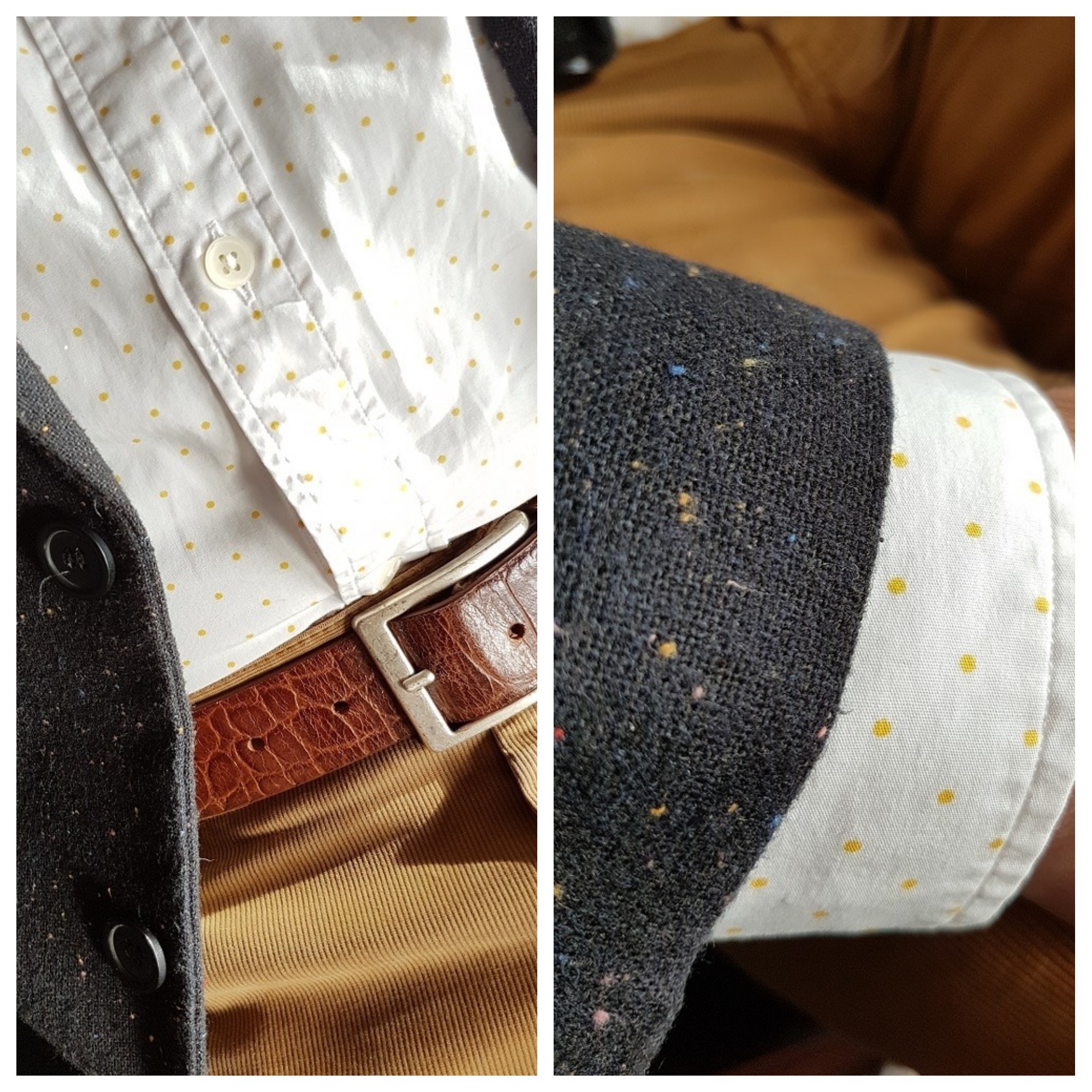 Zo’n okergele broek is best lastig om te combineren, dus als je een shirt met een gele stippel tegenkomt, meteen kopen. Toevalligerwijs zitten er ook wat gele stippels in het colbert. Mooie bruine riem erbij en onderaan schoenen in dito kleur en je bent helemaal het mannetje.