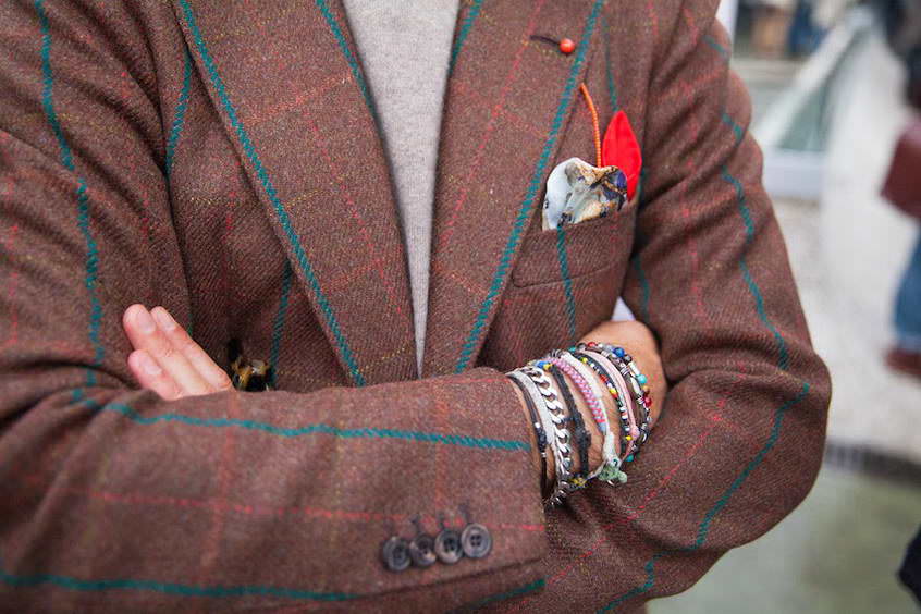 Knoopjes onder aan de mouw die deels over elkaar heen liggen (ze ‘kussen elkaar’, de internationaal gebruikelijke term is dan ook kissing buttons) duiden oorspronkelijk op kostbaar handwerk. De moderne man combineert dat jasje natuurlijk met een pochet en armbanden!