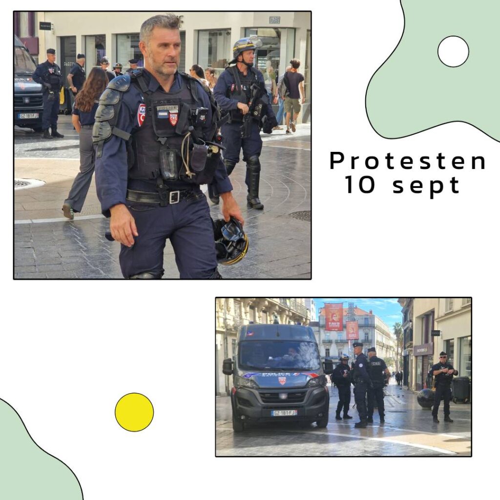 In Nantes in 2023 de pensioendemonstraties. Onderweg naar La Guierche in 2024 lieten de boeren hun stem horen. Ik kon met de auto nog net de afgesloten wegen vermijden. En nu zat ik er met mijn neus bovenop in Montpellier. Tegen de voorgenomen besparingen van de regeringen dit keer. Op 10 september 2025.