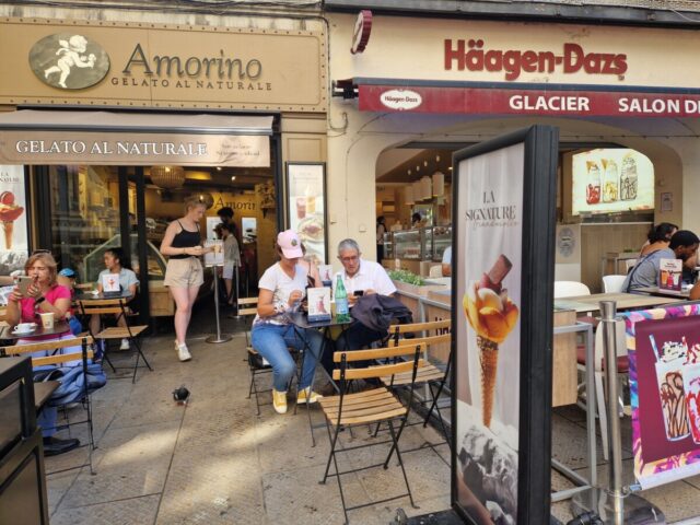 Kokos met lychee, sesamijs. Ook zie ik dropijs (voor een volgende keer?), maar het beste ijs tot dusver is bij de derde ijssalon. Deze Italiaanse glacier ligt zij aan zij met die van Häagen Daz. Een merk dat ik thuis ook vaak in de vriezer heb liggen.