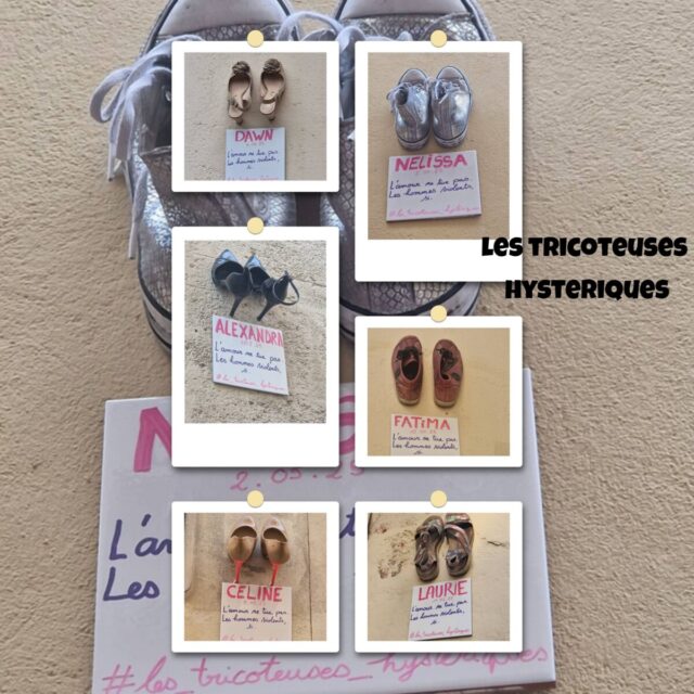 « L’amour ne tue pas. Les hommes violents. Si.” En de datum van overlijden. Ondertekend : Les tricoteuses hystériques.